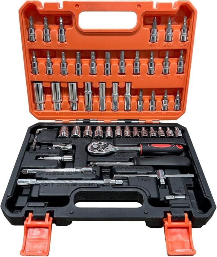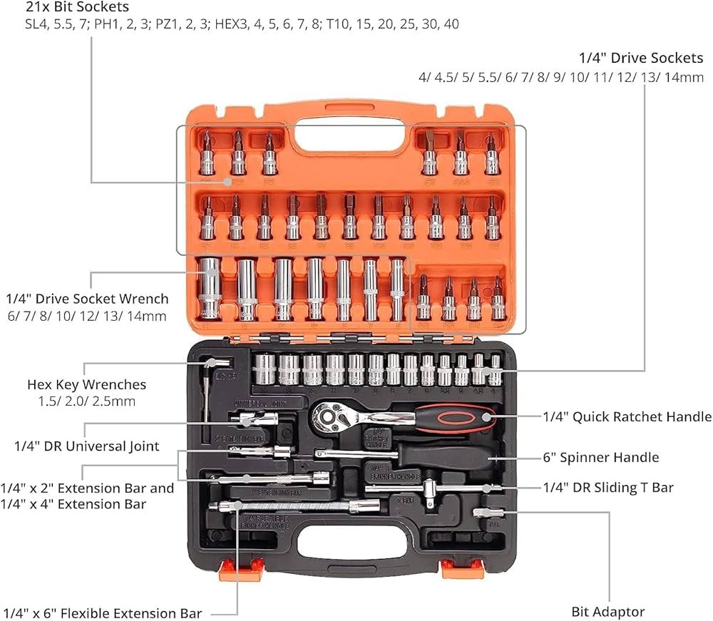 The multipurpose socket set is 100 Percent waterproof, junk free and durable quality., The Socket set is made from cold forged high grade chrome vandium steel., Package Contains-: 13 pc 1/4 sockets 4,4.5,5,5.5,6,7,8,9,10,11,12,13,14, 7 pc 1/4 deep sockets 6,7,8,10,12,13,14, 21 pc 1/4 bit sockets FD 4,5.5,7 PH 1,2,3 PZ 1,2,3 HW 3,4,5,6,7,8 T10,15,20,25,30,40, 3pc Hex key 1.5,2,2.5mm, 1pc 1/4 DR Universal Joint,, 2pc 1/4 DR Extension Bar 2&4, 1pc 1/4 DR Flexible Extension 6, 1pc 1/4 DR Sliding Bar, 1pc 1/4 DR Adaptor, 1pc 1/4 DR Quick Ratchet handle, 1pc 1/4 DR Spinner handle 6, 1pc Blowing Mould case, Chrome vanadium steel offers sharper appearance and better corrosion resistance thus giving it a long life., The socket set Can be used for vehicle maintenance, repair tools and many more applications.